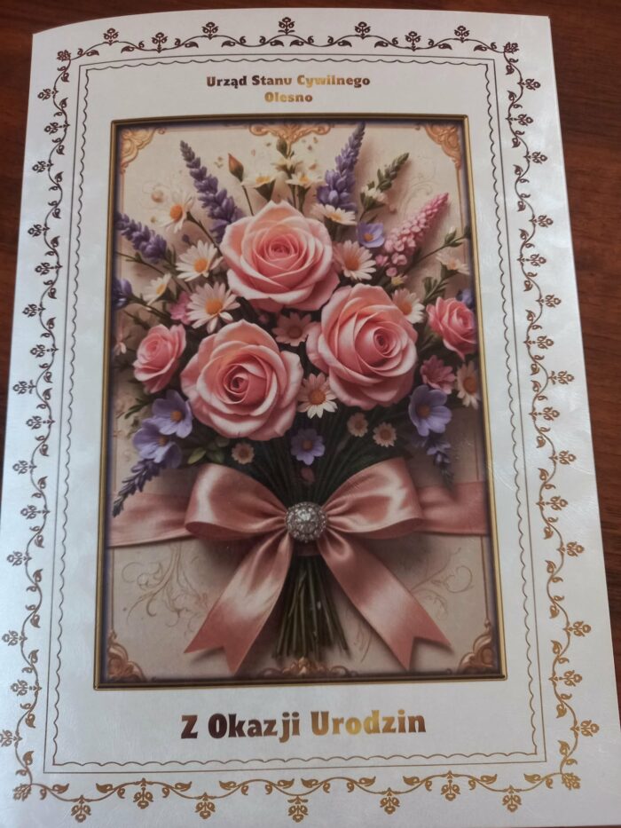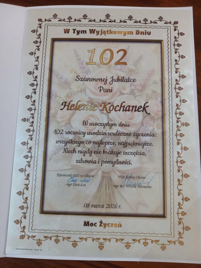 Z okazji tak zacnej rocznicy urodzin Szanowną Jubilatkę odwiedził Wójt Gminy Olesno Witold Morawiec i Kierownik Urzędu Stanu Cywilnego Ewa Łoś, aby przekazać na jej ręce kwiaty, kosz upominkowy i okolicznościowy adres z życzeniami. Nie zabrakło smacznego tortu i poczęstunku oraz toastu za zdrowie Jubilatki. Pani Helena cieszy się ogromnym wsparciem rodziny oraz pogodą ducha. W swoim życiu wychowała dwoje dzieci, doczekała się ośmiu wnuków i ośmiu prawnuków.