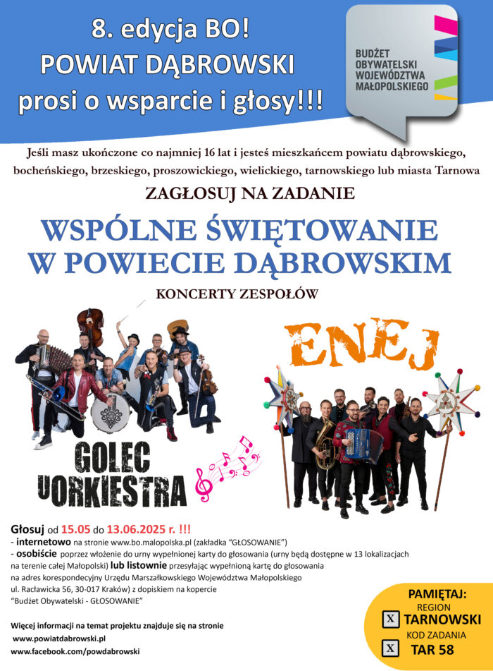 Zachęcamy do oddania głosu na projekt pn. „Wspólne Świętowanie w Powiecie Dąbrowskim”, które zostało zgłoszone do dofinansowania w ramach 8. edycji Budżetu Obywatelskiego Województwa Małopolskiego przez Starostę Dąbrowskiego Lesława Wieczorka.