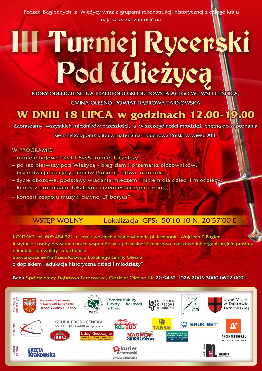 [nbsp][nbsp][nbsp] Całość rozpocznie się w sobotę 18 lipca o godzinie 12 – tej. Planujemyturniej walki mieczem 1vs1, 5vs5, współzawodnictwo łucznicze oraz po raz pierwszy pod Wieżycą – bieg dam i przemarsz biczowników. Liczymy na przybycie wyjątkowo licznej grupy rekonstruktorów historycznych. Udział potwierdziło już ponad 100 osób z całego kraju. Tradycyjnie w naszym projekcie mogą uczestniczyć najmłodsi – w chwilach wolnych między konkurencjami poprowadzimy dla nich warsztaty walki mieczem i strzelania z łuku. Przewidujemy też udział rzemieślników z epoki oraz lokalnych wytwórców tradycyjnej żywności, którzy wystawią kramy ze swymi wyrobami. Pojawi się również zespół muzyki dawnej „Tiboryus” .Wstęp wolny.
