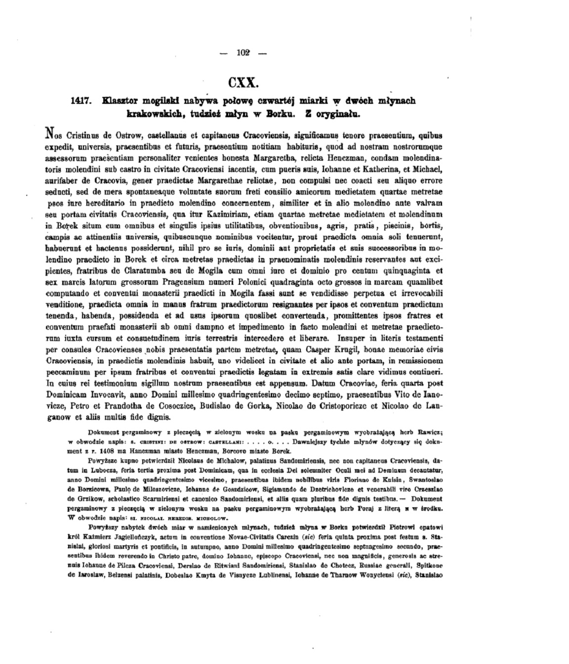 W roku 1864 Towarzystwo Naukowe Krakowskie wydało potężny zbiór dokumentów pod nazwą ”Monografia Opactwa Cystersów we wsi Mogile”. Składa się on z dwóch tomów – w pierwszym znajdujemy część badawczą i opisową a więc dzieje klasztoru, wygląd zabudowań, historię opatów, w drugim zestawienie tzw. dyplomów. I tu pod numerem CXX możemy przeczytać łaciński tekst z 1417 roku będący odpisem z oryginału.
