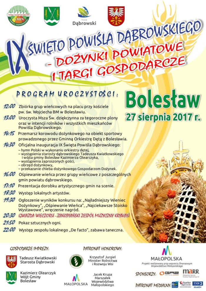 W niedzielę, 27 sierpnia br. na obiekcie sportowym w Bolesławiu odbędzie się już po raz dziewiąty „Święto Powiśla Dąbrowskiego – Dożynki Powiatowe i Targi Gospodarcze”, promujące polskie rolnictwo i przedsiębiorczość. Serdecznie zapraszamy do udziału w tym wydarzeniu!