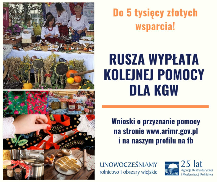 Nawet do 5 tys. zł dla KGW – Nabór wniosków od 7 maja! Pomoc finansowa po raz kolejny trafi do Kół zarejestrowanych w ARiMR. Wniosek o przyznanie można znaleźć TUTAJ Warunkiem otrzymania dotacji także w tym roku jest rozliczenie uprzednio uzyskanej pomocy. Będzie ona przyznawana do wyczerpania środków. Na ten cel przeznaczono kwotę 40 mln zł. Rozporządzenie Ministra Inwestycji i Rozwoju, które weszło w życie z dniem 7 maja, mówi o tym, że pomoc będzie mogła być przyznawana Kołu raz w roku i trzeba będzie ją wykorzystać do 31 grudnia roku, w którym została przyznana. Stawki pozostają bez zmian i są zależne od liczby członków w kole. Pieniądze wypłacać będzie ARiMR niezwłocznie po dniu wydania decyzji o przyznaniu pomocy. Wnioski będzie można złożyć nie później niż do 31 października.
