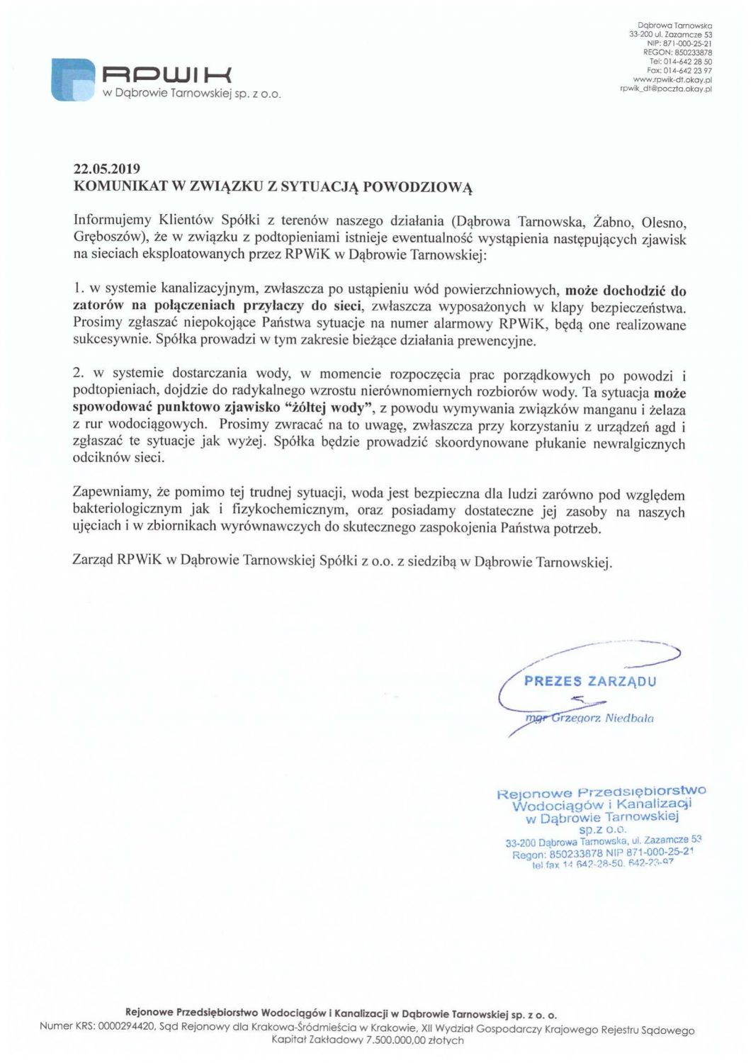 Komunikat RPWiK w Dąbrowie Tarnowskiej Spółki z o.o. w związku z sytuacją powodziową