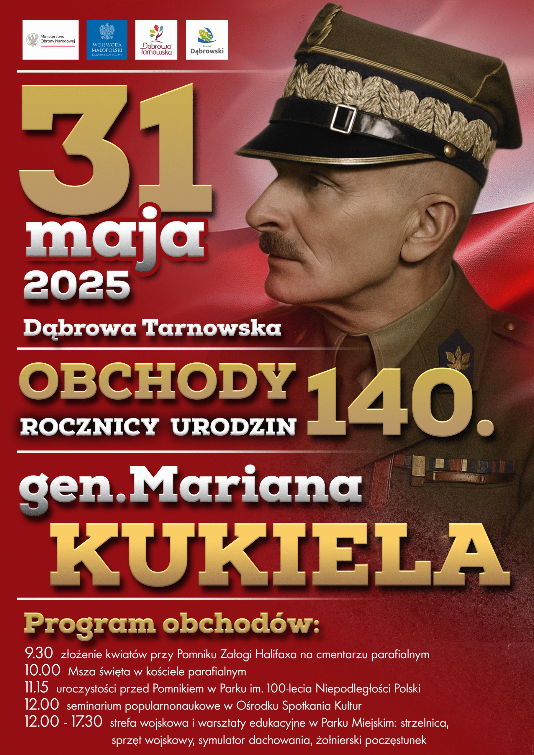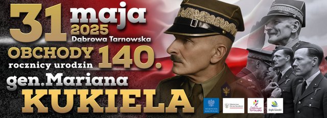 Wojewoda Małopolski Krzysztof Jan Klęczar oraz Burmistrz Dąbrowy Tarnowskiej serdecznie zapraszają na uroczyste obchody 140. rocznicy urodzin gen. Mariana Kukiela pod Honorowym Patronatem Wiceprezesa Rady Ministrów, Ministra Obrony Narodowej Władysława Kosiniaka-Kamysza, które odbędą się 31 maja 2025 r. (tj. sobota) w Dąbrowie Tarnowskiej.
