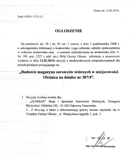 Ogłoszenie o wydaniu decyzji środowiskowej
