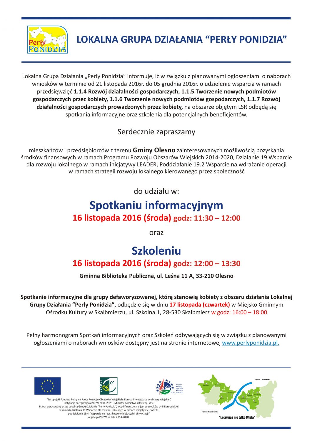 Lokalna Grupa Działania „Perły Ponidzia” informuje, iż[nbsp]w[nbsp]związku z[nbsp]planowanymi ogłoszeniami o naborach wniosków w terminie od 21 listopada 2016r. do 05 grudnia 2016r. o[nbsp]udzielenie wsparcia w[nbsp]ramach przedsięwzięć 1.1.4 Rozwój działalności gospodarczych, 1.1.5 Tworzenie nowych podmiotów gospodarczych przez kobiety, 1.1.6 Tworzenie nowych podmiotów gospodarczych, 1.1.7 Rozwój działalności gospodarczych prowadzonych przez kobiety, na obszarze objętym LSR odbędą się spotkania informacyjne oraz szkolenia dla[nbsp]potencjalnych beneficjentów.