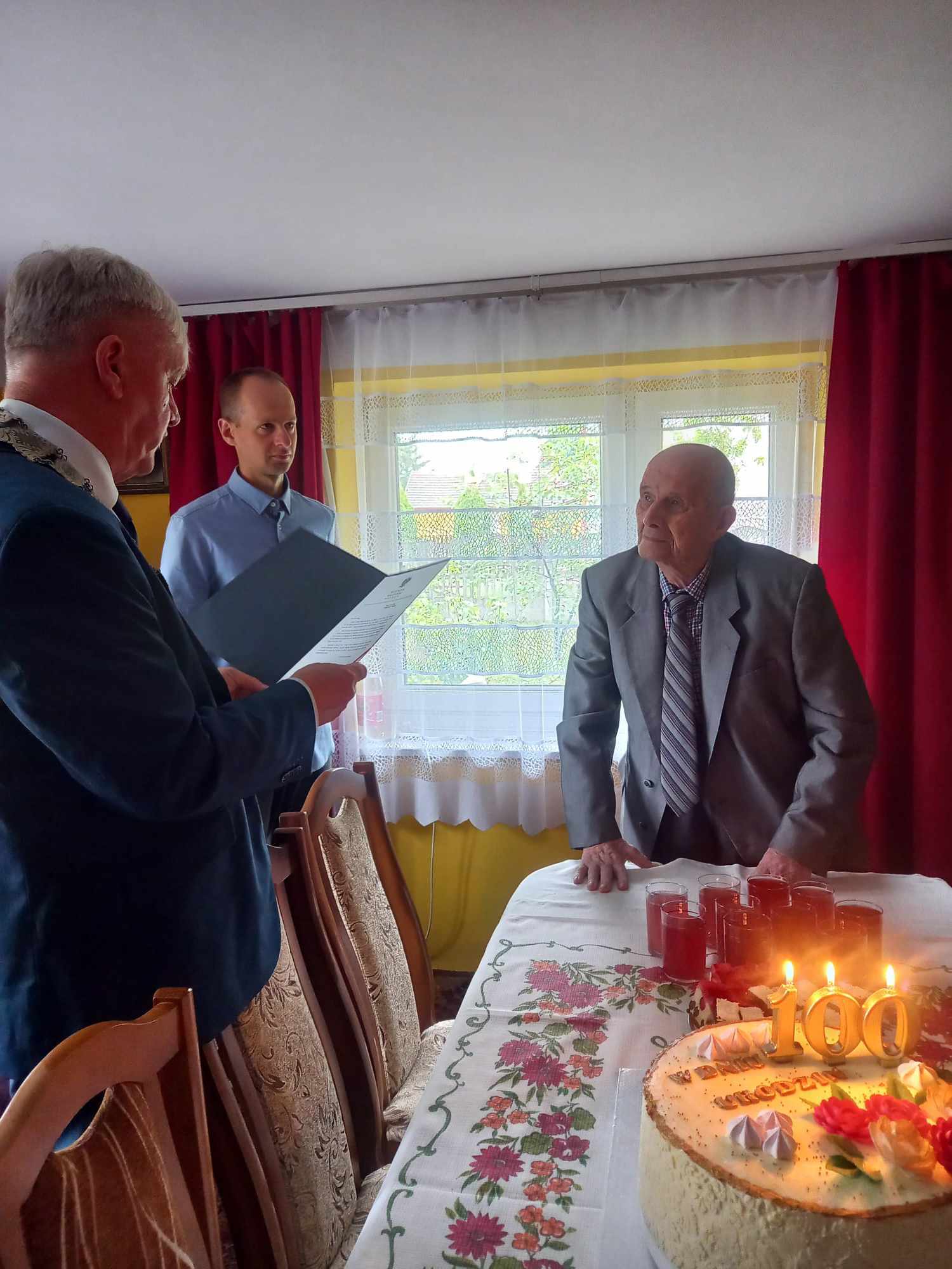 Z tej okazji Szanownego Jubilata odwiedził Wójt Gminy Olesno Witold Morawiec wraz z kierownikiem Urzędu Stanu Cywilnego Ewą Łoś, by w imieniu Kancelarii Premiera oraz Wojewody a także samorządu i mieszkańców naszej gminnej społeczności wręczyć adresy okolicznościowe, upominki i kwiaty a przede wszystkim złożyć gratulacje i najserdeczniejsze życzenia wszelkiej pomyślności i pogody ducha oraz kolejnych lat życia w jak najlepszym zdrowiu w klimacie życzliwości i wdzięczności otoczenia. Nie zabrakło poczęstunku w rodzinnym gronie, smacznego tortu oraz toastu za zdrowie Jubilata, dla którego odśpiewano wspólnie 200 lat.