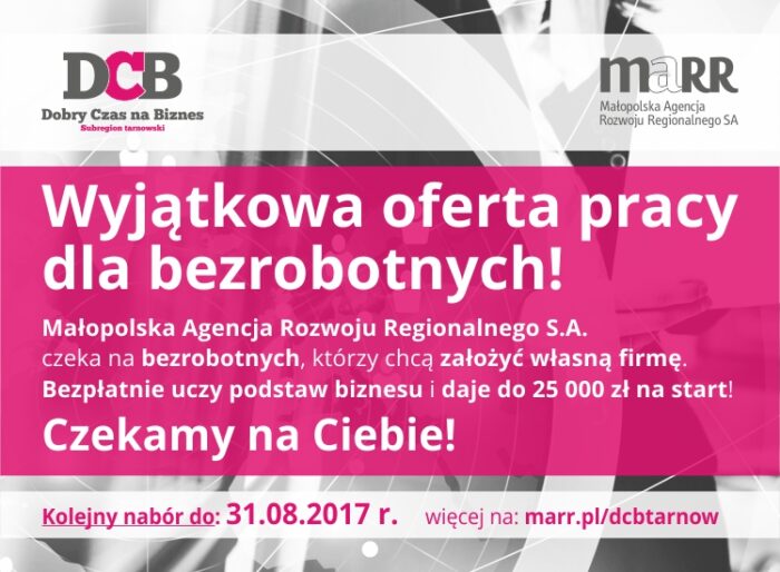 Małopolska Agencja Rozwoju Regionalnego S.A. jako realizator projektu „Dobry Czas na Biznes – Subregion tarnowski” współfinansowanego z Europejskiego Funduszu Społecznego w ramach działania 8.3.1. Regionalnego Programu Operacyjnego WojewództwaMałopolskiego na lata 2014 – 2020 zaprasza do wzięcia udziału w ww. projekcie osoby zamieszkujące Powiat Dąbrowski chcące założyć własną działalność gospodarczą.