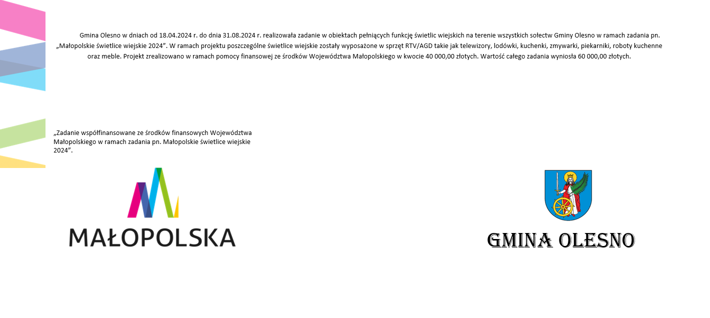 „Zadanie współfinansowane ze środków finansowych Województwa Małopolskiego w ramach zadania pn. Małopolskie świetlice wiejskie 2024”.